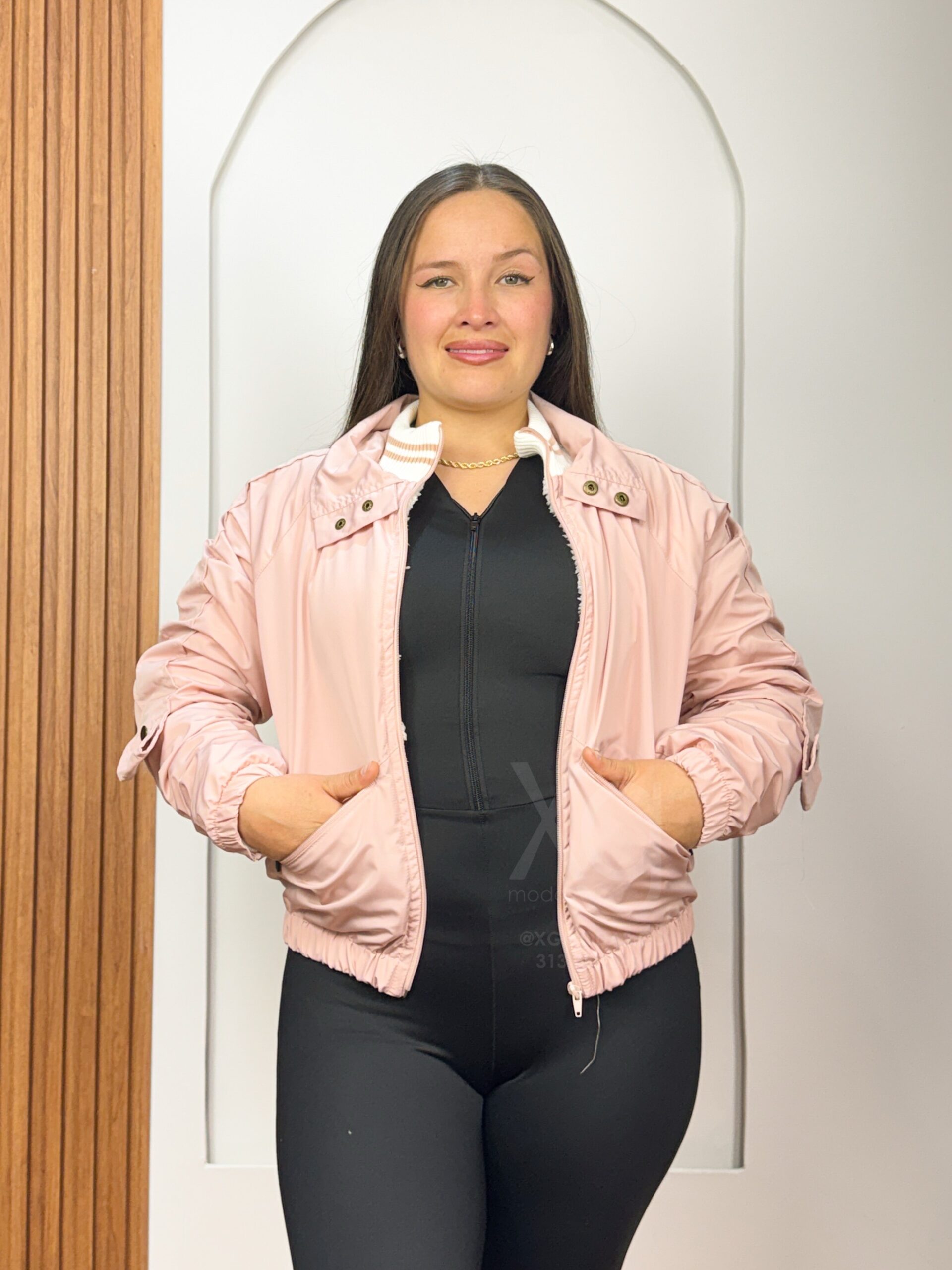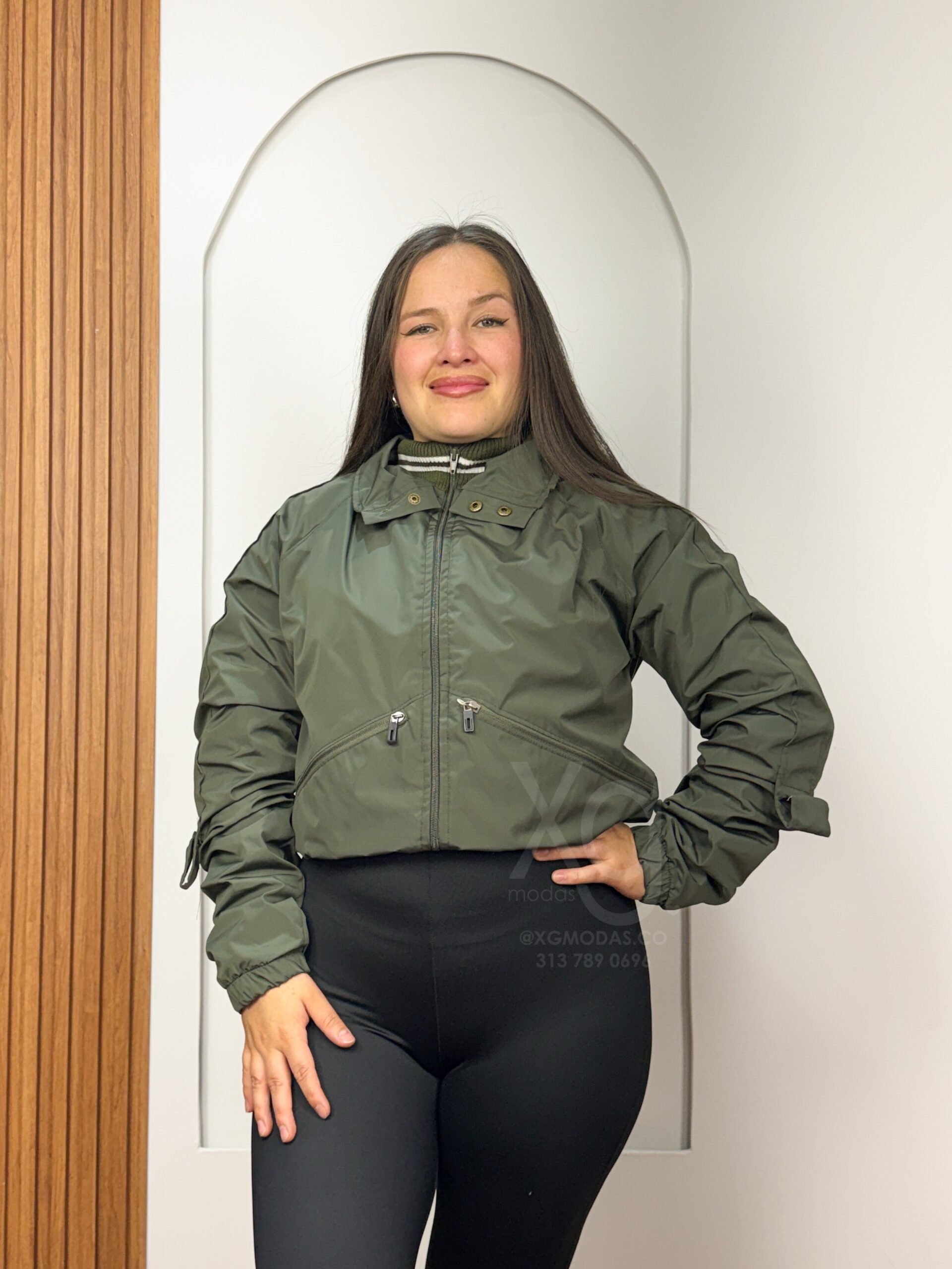 Presenta cuello alto y bolsillos funcionales.