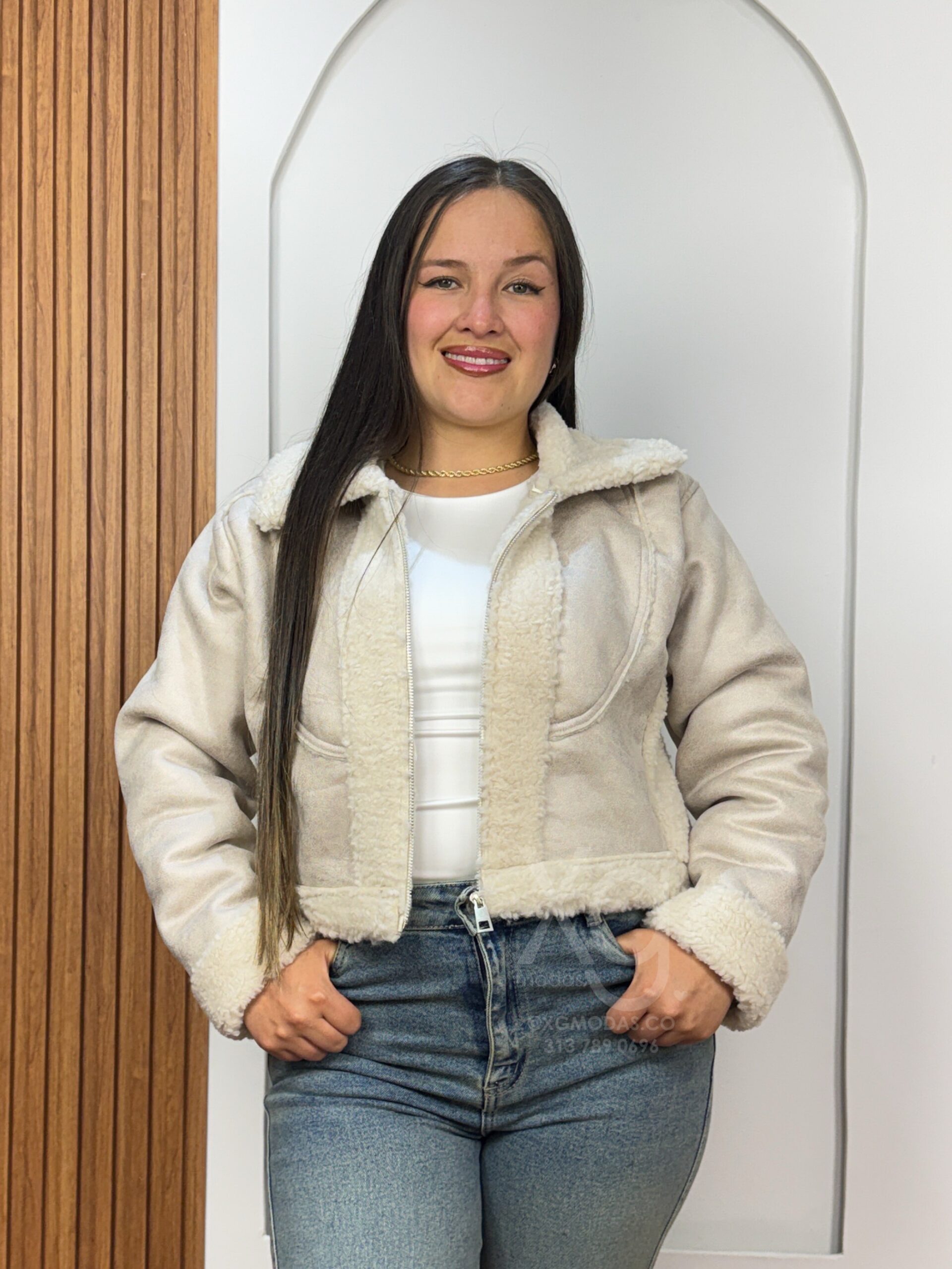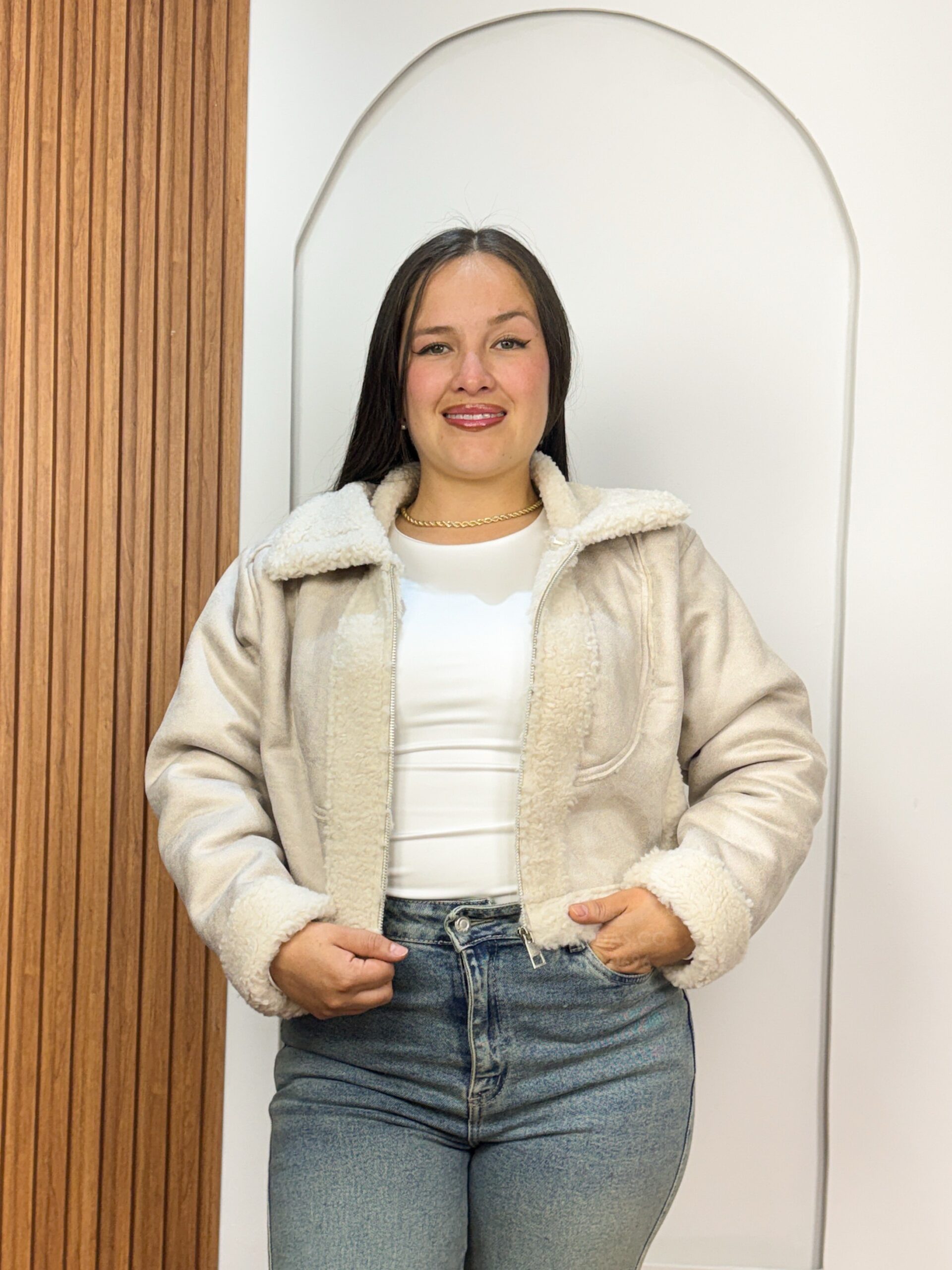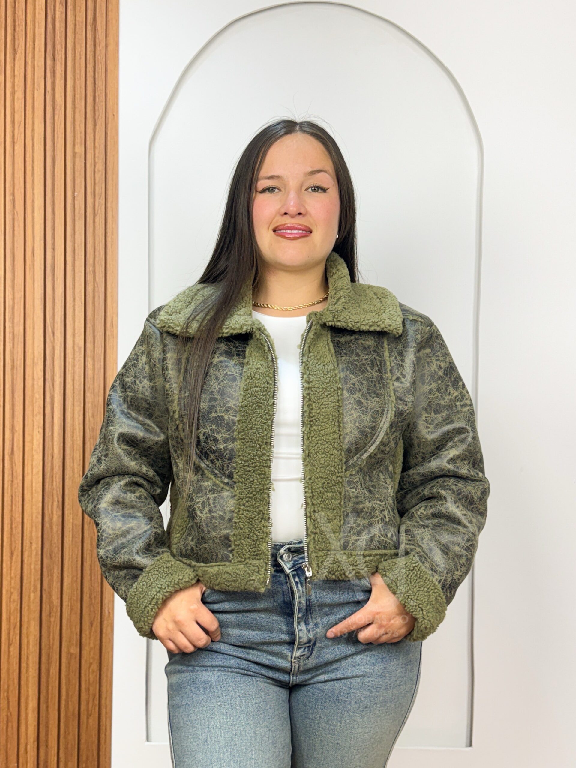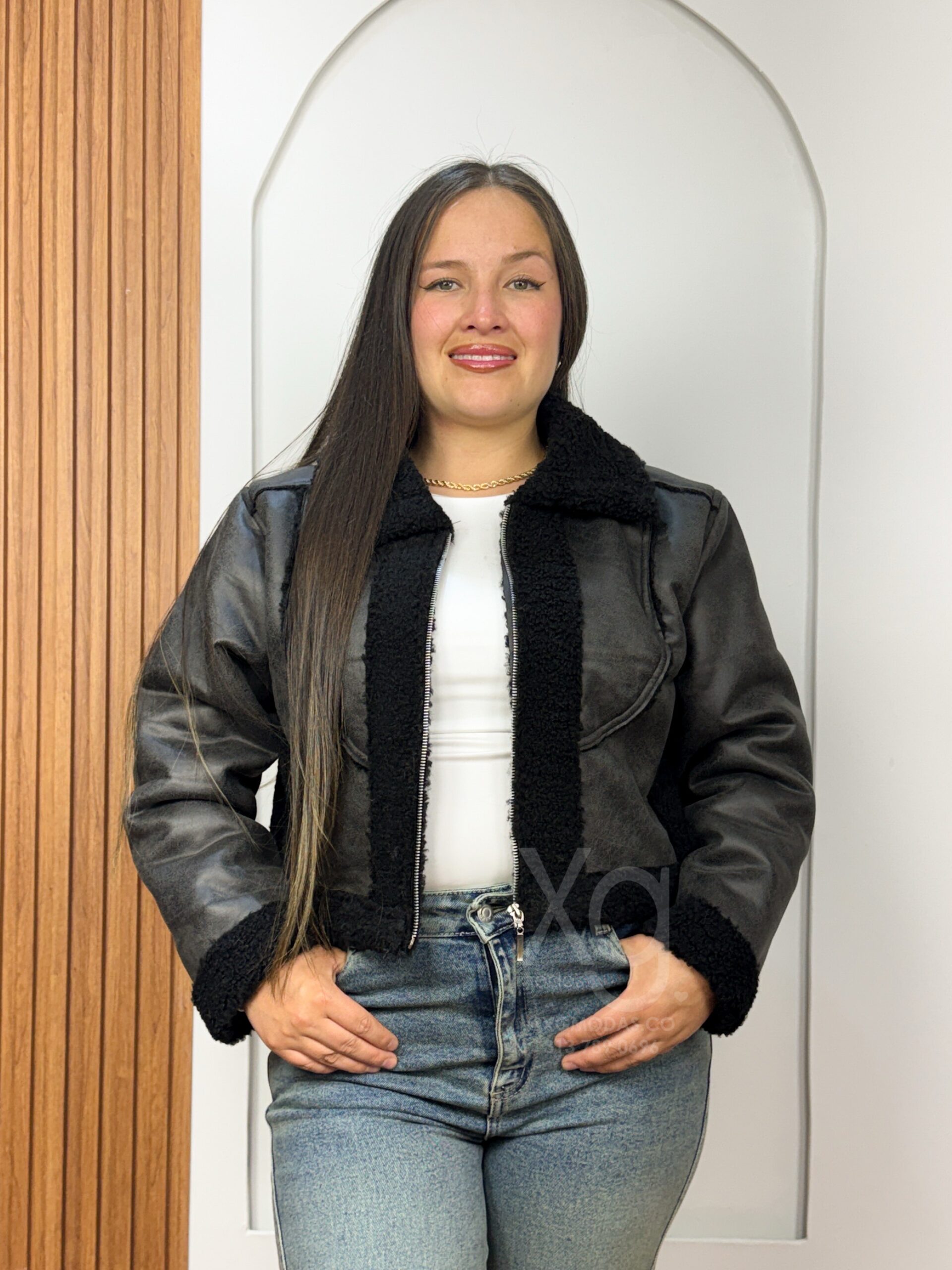 Experimenta el lujo y la durabilidad con nuestra chaqueta tipo borrego. Esta prenda de alta calidad está elaborada con un exterior de cuero gamusado premium y un forro interior completo de borrego sintético de alta densidad para un aislamiento térmico superior. Presenta un cuello de solapa funcional, puños de borrego ajustados.