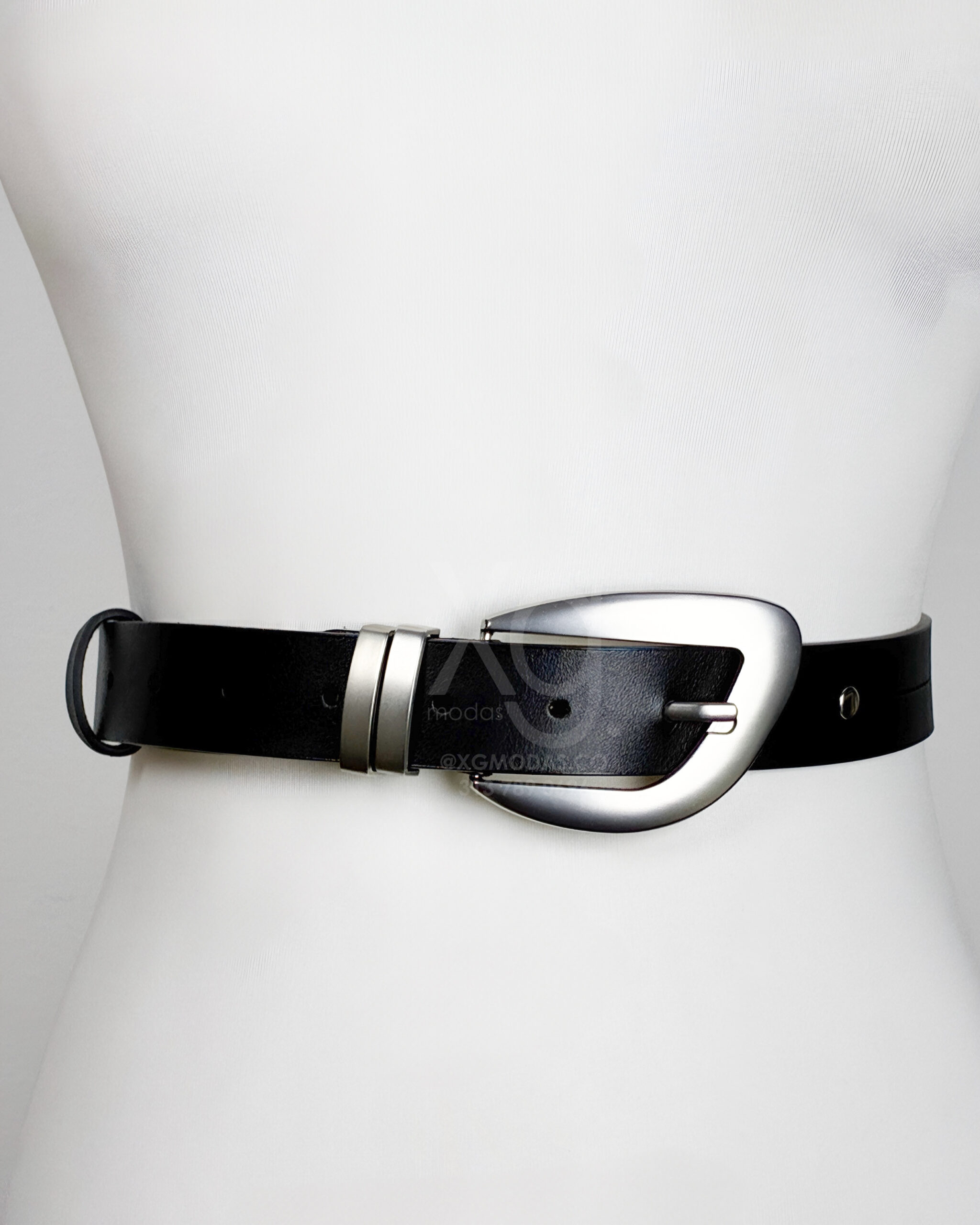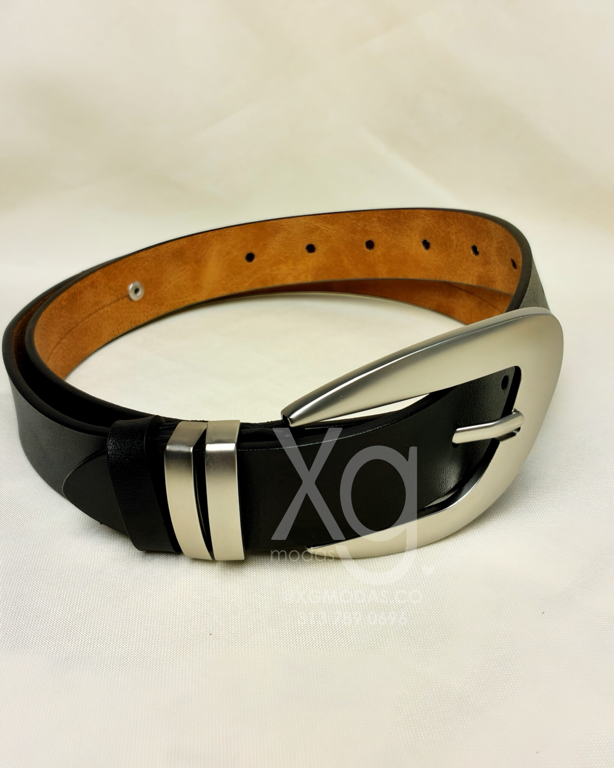 El accesorio que combina con todo. Este cinturón negro destaca por su doble pasador metálico y una hebilla de diseño ergonómico en color plata satinada. Perfecto tanto para ajustar un vestido vaporoso como para elevar tus jeans favoritos.